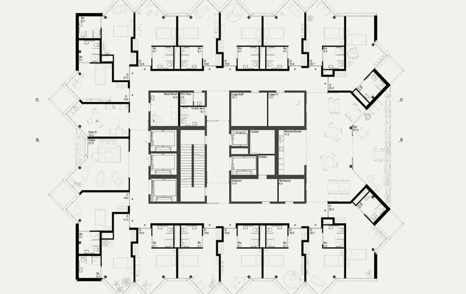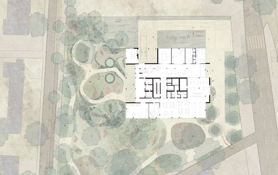 Altersgerechtes Wohnen direkt neben einer neu erbauten Schule spannt das Maximum an demografischer Vielfalt und damit auch sozialer Begegnungen auf. Neben individuellem Wohnraum für ein möglichst selbstbestimmtes später auch bedürfnisgerechtes, betreutes Wohnen, gilt es für die sozialen und funktionalen Synergien auch menschlich dimensionierte und wohlgestaltete Aufenthaltsräume bereitzustellen, welche die verschiedenen Bedürfnisse der Bewohnenden abdecken, die einzelnen Nutzungen jedoch nicht isolieren, untereinander und mit dem umgebenden Quartier verweben.
