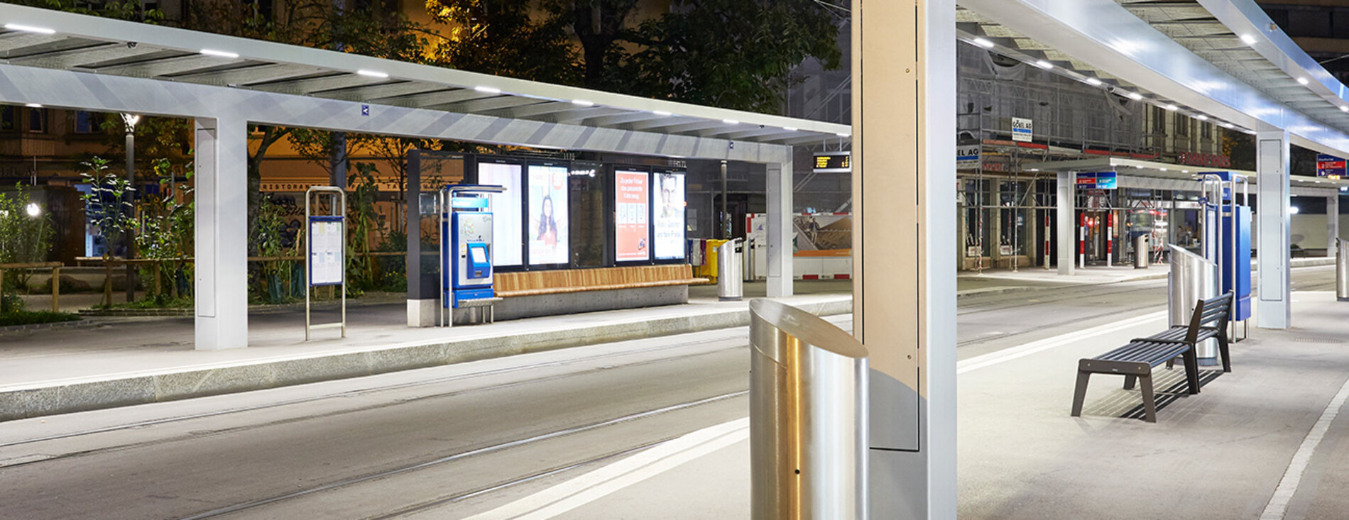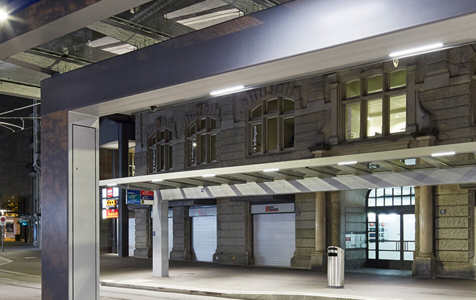 Die Tramhaltestelle am Stauffacher wurde behindertengerecht und wetterfest umgebaut. Vier neue Wetterschutzdächer aus Stahl und Glas folgen der Gleisgeometrie und fassen den Raum der Badenerstrasse ein. Die Station ist mit ihren täglich 50 000 Fahrgästen der Angelpunkt für die Planung des städtischen Tramfahrplans. Beim Ausbau wurde die WC-Anlage im Haltestellenbereich ins angrenzende Wohnquartier verschoben. Das schafft Platz. Dafür kamen 25 neue Veloabstellplätze hinzu.